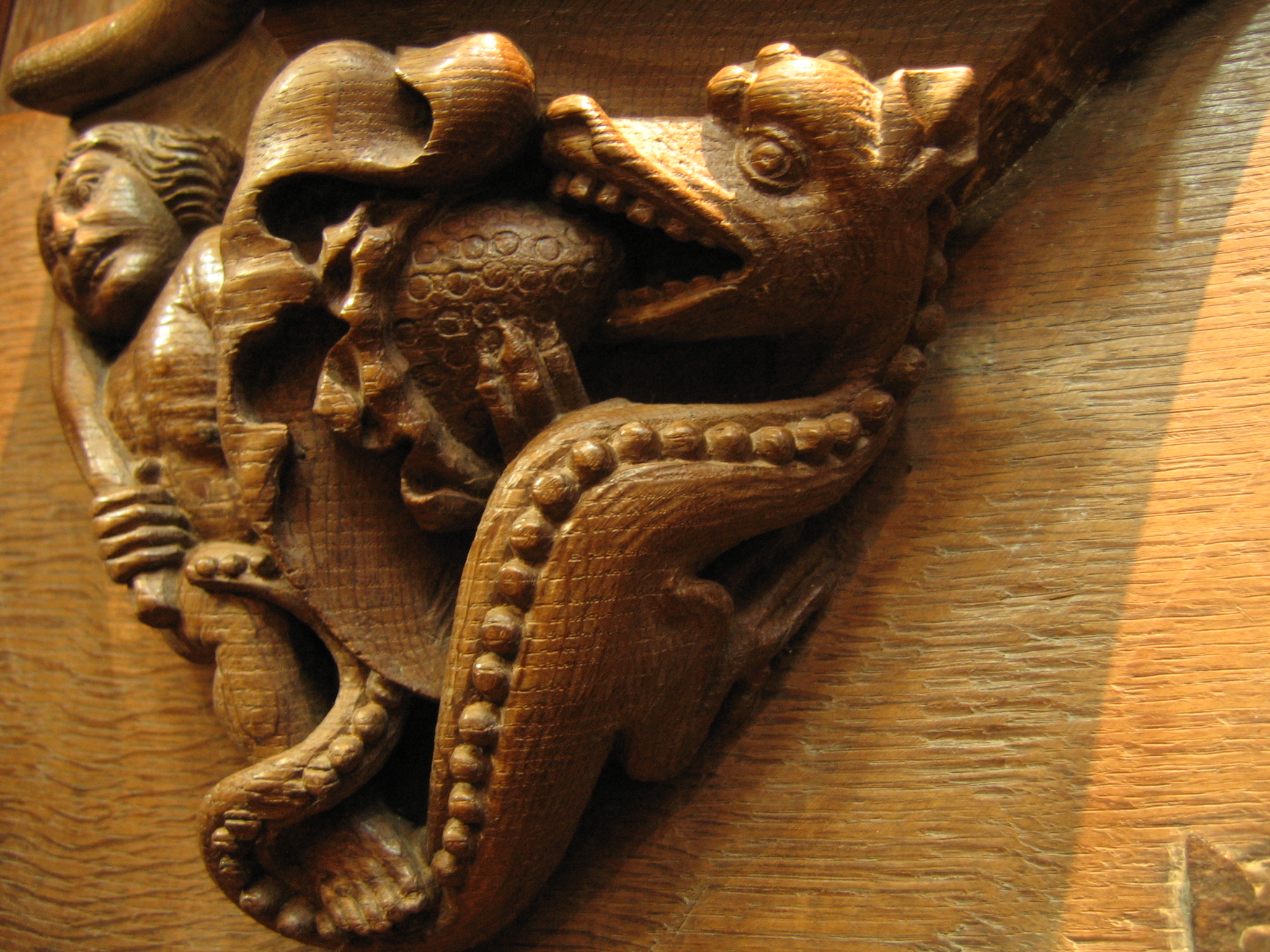 Miséricode : détail du dragon. Une de ses pattes aux longues griffes s'appuie sur le bouclier végétal tendu par le jeune homme tandis qu'il mord à pleines dents dans la partie centrale de l'objet.Immatriculation