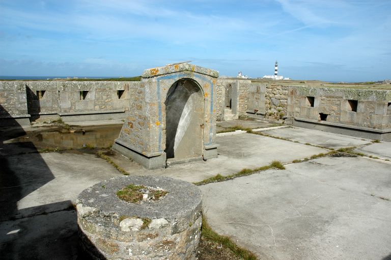 Vue du réduit de batterie de côte de Loqueltas. La terrasse est dotée de huit bretèches et créneaux de fusillade. En arrière-plan : le phare du Créac'hImmatriculation