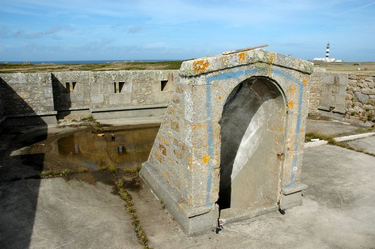 Vue du réduit de batterie de côte de Loqueltas. La terrasse est dotée de huit bretèches et créneaux de fusillade. En arrière-plan : le phare du Créac'hImmatriculation