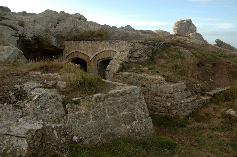 Batterie de côte (en angle droit ; 2 canons G de 95 mm sur affûts G de campagne) et niches à munitions du Niou Izella (Ouessant),