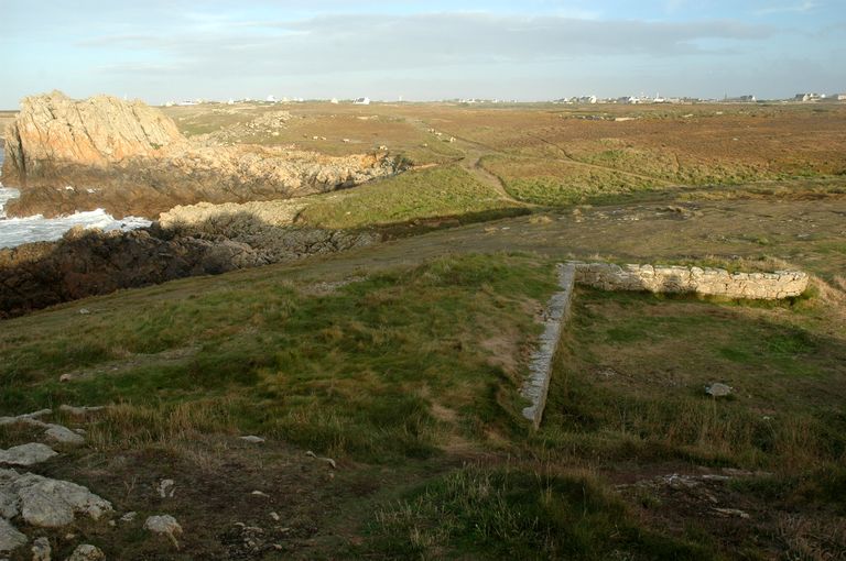 Batterie de côte (en angle droit ; 2 canons G de 95 mm sur affûts G de campagne) et niches à munitions du Niou Izella (Ouessant),