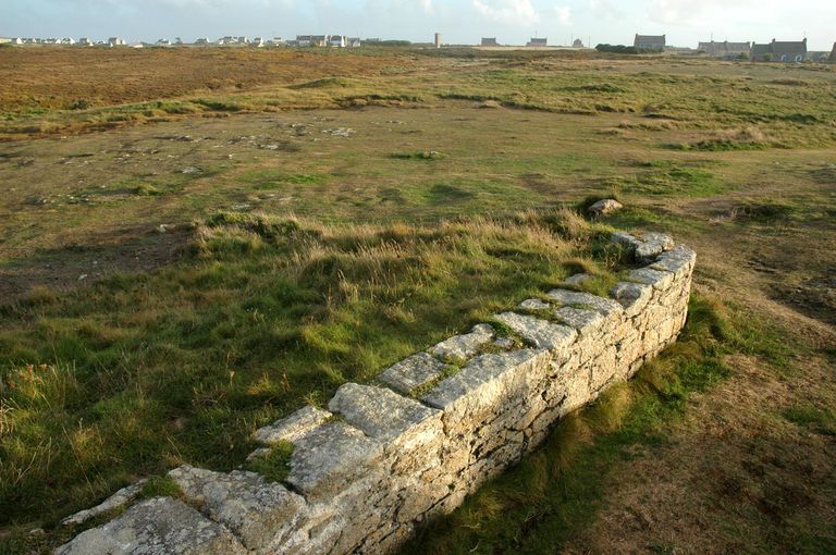 Batterie de côte (en angle droit ; 2 canons G de 95 mm sur affûts G de campagne) et niches à munitions du Niou Izella (Ouessant),