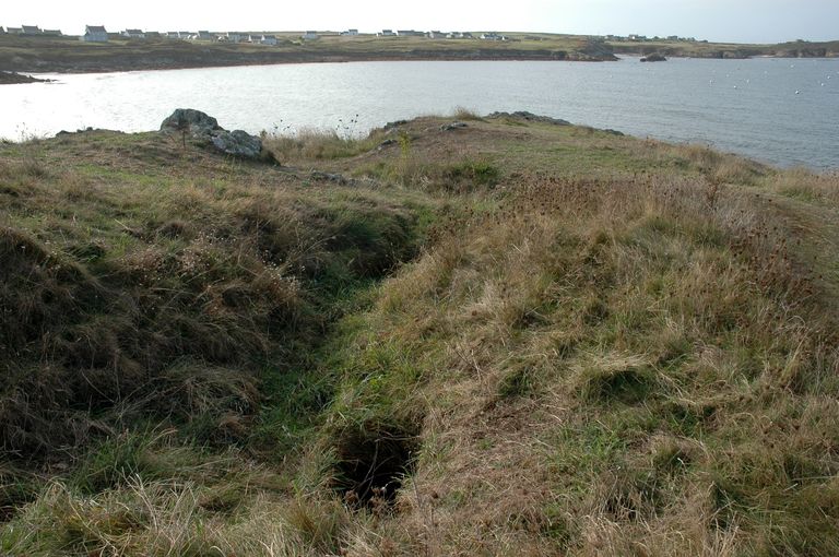 Vue de l'ensemble fortifié situé au nord de la plage de Corz, poste d'observation et de mitrailleuse en maçonnerie construit dans le flanc de la falaiseImmatriculation