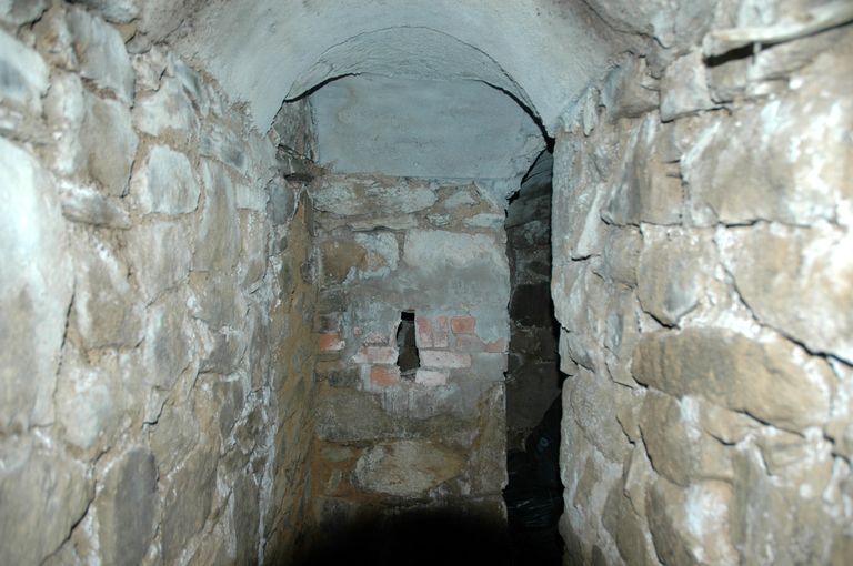 Vue de l'ensemble fortifié situé à l'est de la plage du Prat, casemate pour canon de campagne aménagée dans le roc, créneau de défense flanquant le couloir d'accèsImmatriculation