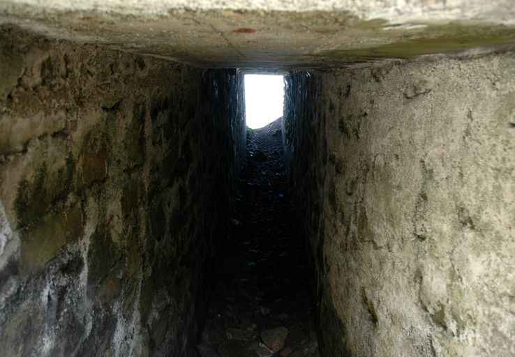 Vue de l'ensemble fortifié de Penn ar Viler, abri bétonné camouflé par un appareillage de pierres sèches, couloir d'accèsImmatriculation