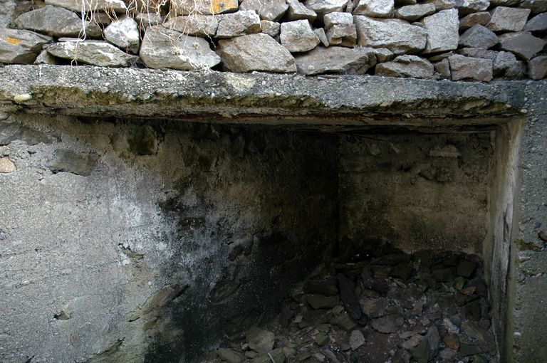 Vue de l'ensemble fortifié de Penn ar Viler, abri bétonné souterrain, position pour un canon de défense antiaérien, niche à munitionsImmatriculation