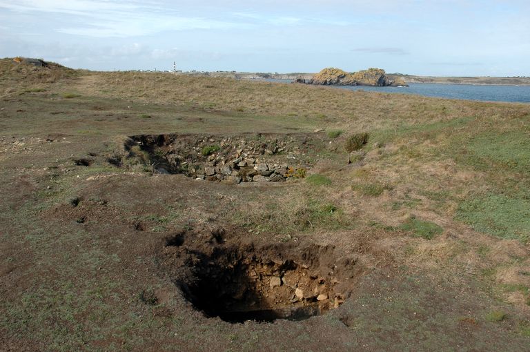 Vue de l'ensemble fortifié de Penn ar Viler, abri bétonné souterrain, position pour un canon de défense antiaérienImmatriculation