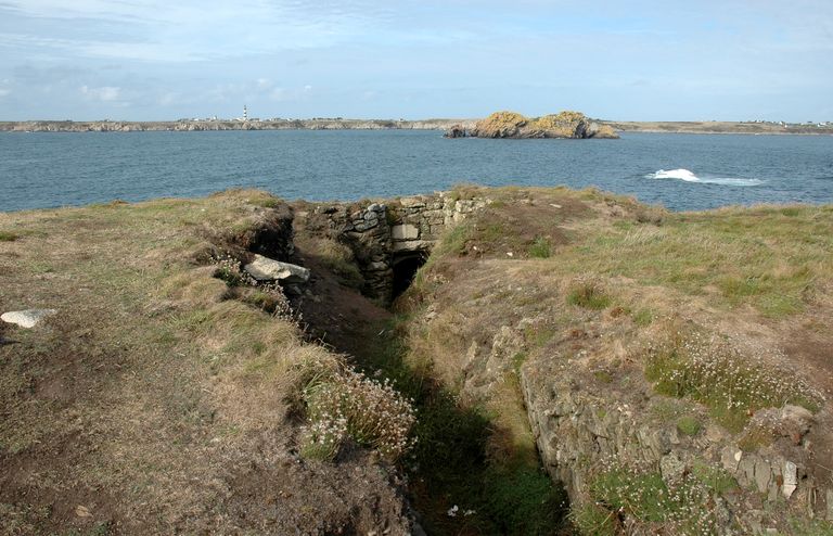 Vue de l'ensemble fortifié de Penn ar Viler, tranchée menant à une casemate aménagée dans le rocher pour canon de campagne tirant vers le nordImmatriculation