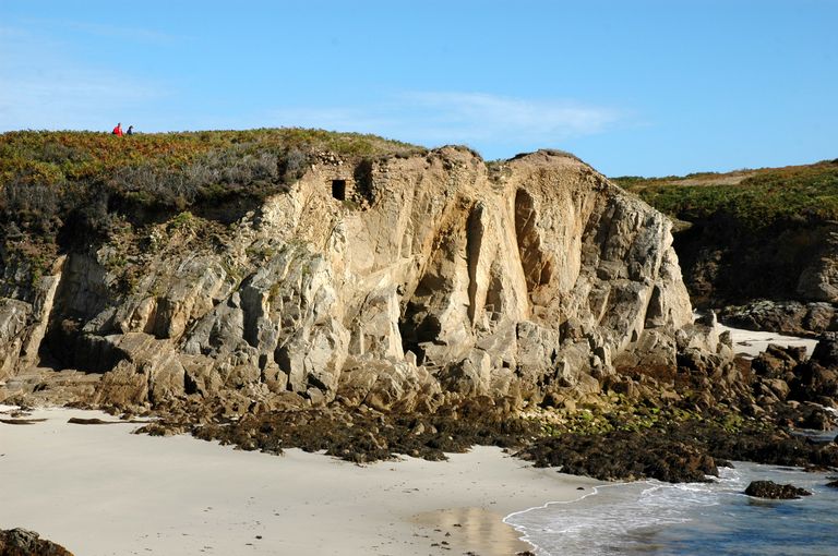 Batterie de côte (en arc de cercle), corps de garde, magasin à poudre (détruits) puis ensemble fortifié allemand de Porz ar Lan (Ouessant),