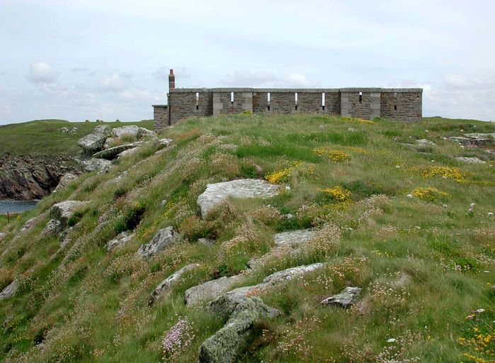 Vue du réduit de batterie de côte de la pointe de Kermorvan depuis l'ouest. L'implantation du réduit derrière un rocher en glacis permet d'utiliser au mieux les créneaux de fusillade de la terrasse pour la défense de l'ouvrageImmatriculation