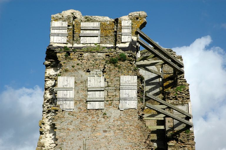 Vue du donjon : niveaux supérieurs (consolidation par étaiement mise en place en 2000)Immatriculation