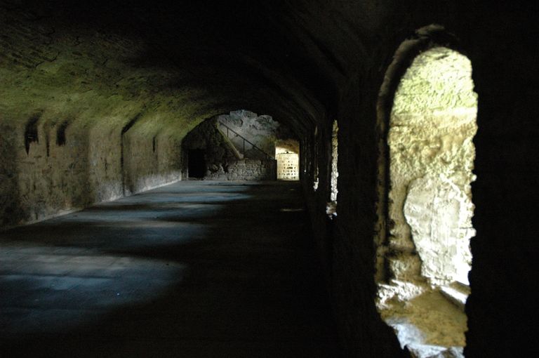Vue du fort détaché du Questel : grande casemate inférieure. La pièce -dotée d'une cheminée à chaque extrémité, comporte deux escaliers d'accès et une porte de communication avec les galeries de contrescarpe via la poterneImmatriculation