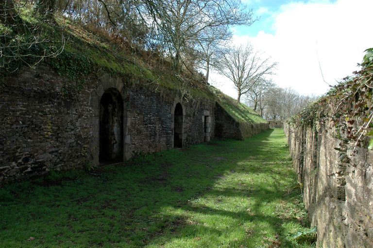 Vue du fort détaché du Questel : face de Penfeld, chemin de ronde, accès au couloir desservant les casernements, à la plate-forme d'artillerie et au magasin d'artillerie (à droite)Immatriculation