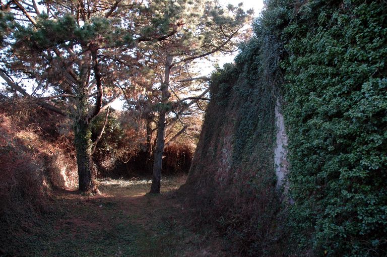Vue du réduit de batterie de côte dit redoute intermédiaire des Blancs Sablons : fossé sec envahi par la végétationImmatriculation