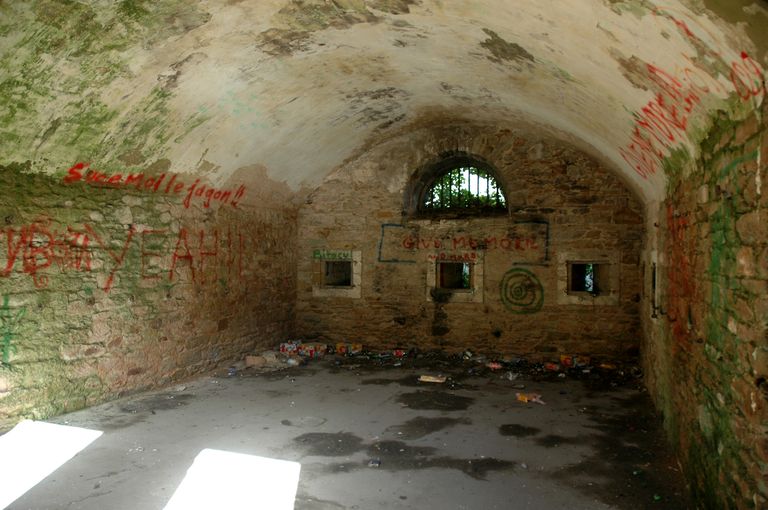 Vue du réduit de batterie de côte dit redoute intermédiaire des Blancs Sablons : casemate servant au logement des soldats (en temps de paix : 6 soldats et un sous officier séparé par une cloison ; en temps de guerre : 8 soldats et un sous officier)Immatriculation