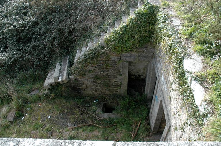 Vue du réduit de batterie de côte dit redoute intermédiaire des Blancs Sablons : escalier (en partie ruiné) desservant la plate-forme d'artillerie ou cavalierImmatriculation