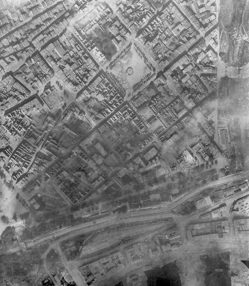 Vue aérienne verticale de Brest, quartier de la place du Champ de Bataille (kiosque). A droite sur la photographie, un bâtiment marqué d'une croix rouge est visible. Septembre 1944Immatriculation