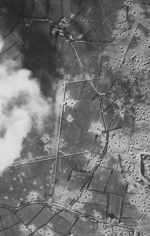 Vue aérienne verticale des fossés anti-chars situés à l'ouest de Brest, septembre 1944. A droite, le fort de KeranrouxImmatriculation