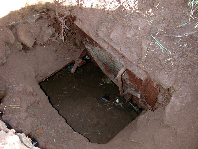 Vue du puits de la cloche bindée : trappe d'accès (état en 2003). L'entrée principale du bunker étant remblayée, le puits de la cloche blindée constitue le seul accèsImmatriculation