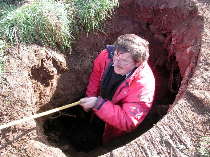 Vue du puits de la cloche bindée : remontée au milieu des détritus (état en 2003). Ici, Hervé Farrant, spécialiste du Mur de l'Atlantique...Immatriculation