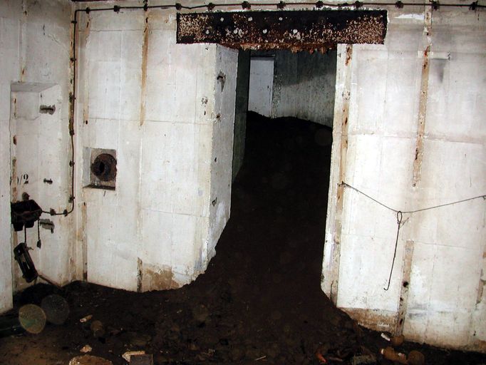 Vue de la pièce de vie - chambre de troupe : entrée. A droite, boîtier de connexion téléphonique surmonté du marquage "B 70/2"Immatriculation