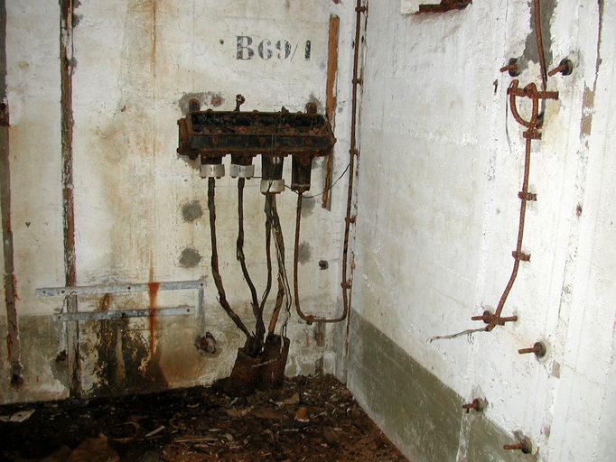 Vue de la chambre de troupe de droite : boîtier de connexion téléphonique surmonté du numéro "B 69/1" et câblage (état en 2003)Immatriculation