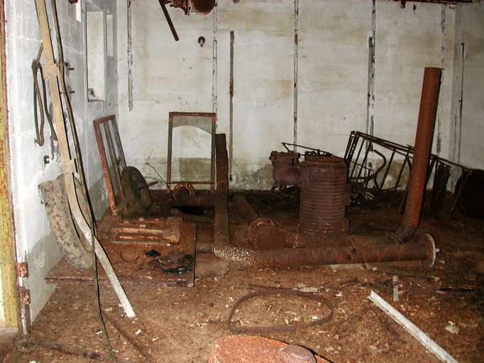 Vue de la chambre de troupe de gauche : poêle de type Wt 80K et tuyaux de ventilation... (état en 2003)Immatriculation
