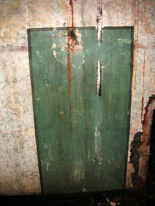 Vue de la pièce de vie - chambre de troupe du bunker : grand rectangle peint en vert (état en 2003)Immatriculation