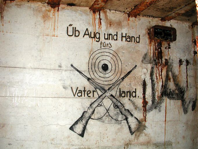 Dans le sas (sur le mur faisant face à la porte de la pièce de vie), peinture murale en trait de couleur noire représentant une cible et deux fusils croisés accompagnée de l’inscription en allemand "Üb Aug und Hand / für's / Vater land." que l'on peut traduire par "Exerce ton oeil et ta main pour la patrie" (état en 2003). Il s'agit d'une maxime de propagande nazieImmatriculation