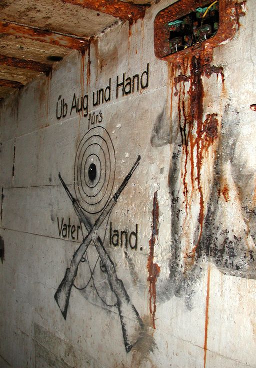 Dans le sas (sur le mur faisant face à la porte de la pièce de vie), peinture murale en trait de couleur noire représentant une cible et deux fusils croisés accompagnée de l’inscription en allemand "Üb Aug und Hand / für's / Vater land." que l'on peut traduire par "Exerce ton oeil et ta main pour la patrie" (état en 2003). Il s'agit d'une maxime de propagande nazieImmatriculation