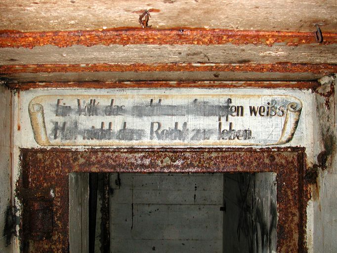 Au-dessus de la porte d'entrée du sas : dans un cartouche, maxime peinte en trait de couleur noire (en partie effacée) : "Ein Volk das nicht zu Kämpfen weiss / Hat nicht das Recht zu leben" que l'on peut traduire par "Un peuple qui ne sait pas se battre, n'a pas le droit de vivre." (état en 2003). Il s'agit d'une maxime de propagande nazie.Immatriculation