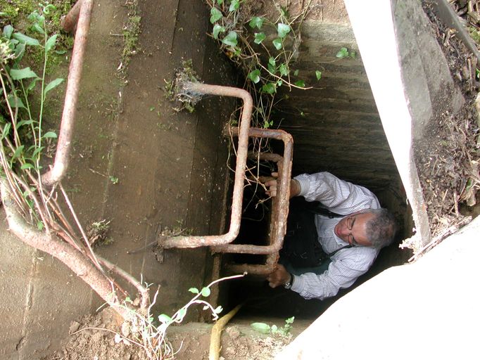 Vue de la remontée par le puits de la sortie de secours du bunker (état en 2003). Ici, Mario Soléra, spécialiste du Mur de l'Atlantique est en train de remonter...Immatriculation