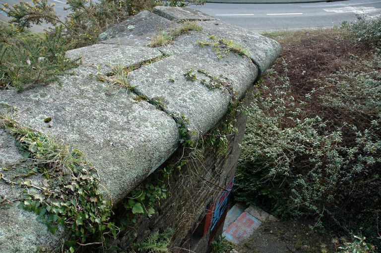 Vue des vestiges des fortifications d'agglomération de Brest au Moulin à poudre : mur défensif percé de créneaux de mousquetterie de la porte de la BrasserieImmatriculation
