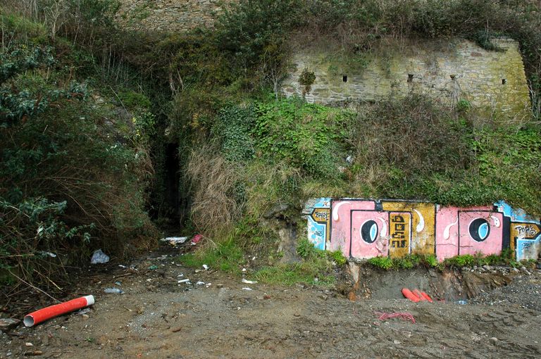 Vue des vestiges des fortifications d'agglomération de Brest : front bastionné du Cours Dajot. Entrée du tunnel allemand servant d'hôpital militaire aménagé sous la rampe construite durant le Second Empire pour le Port de Commerce de PorstreinImmatriculation