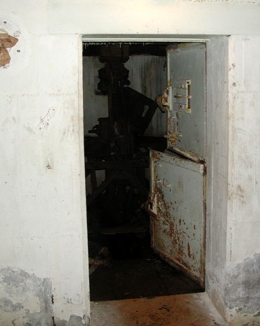 Vue du bunker de type 633 pour mortier (M19) du parc à carburant de Maison Blanche : porte blindée à deux vantaux (haut et bas)Immatriculation