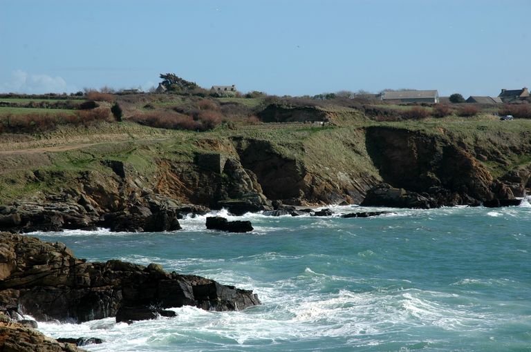 Vue de la pointe Saint-Mathieu. Les falaises ont été aménagées très tôt par la construction de muret de pierres sèches afin de faciliter la récolte du goémon et des œufsImmatriculation