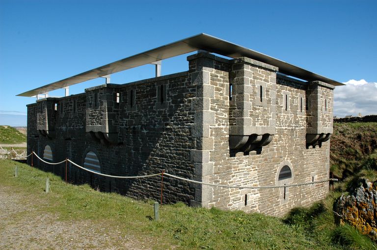 Vue de l'ensemble fortifié de la pointe Saint-Mathieu : corps de garde crénélé modèle 1846 élevé en 1854 devenu cénotaphe en 2005Immatriculation