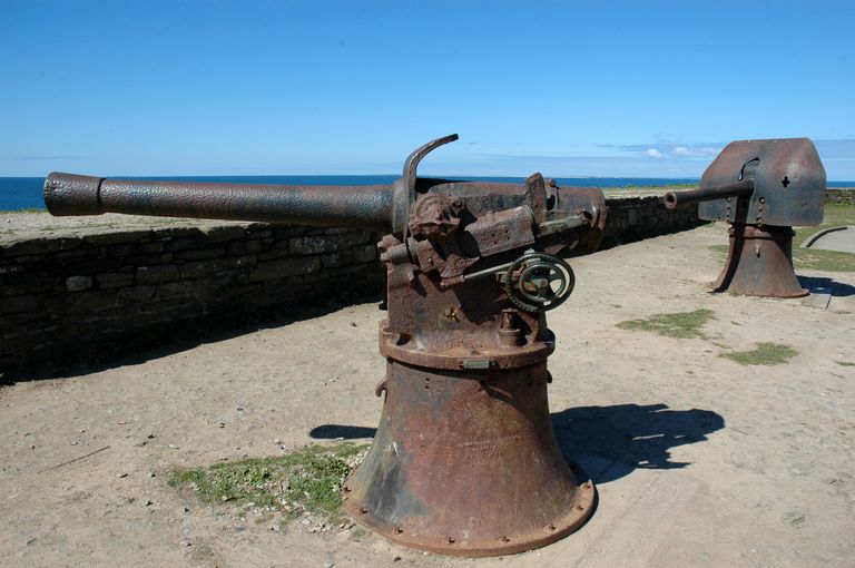 Vue de l'ensemble fortifié de la pointe Saint-Mathieu : batterie de côte encore armée de deux canons Lahitolle de 95 mm modèle 1888Immatriculation