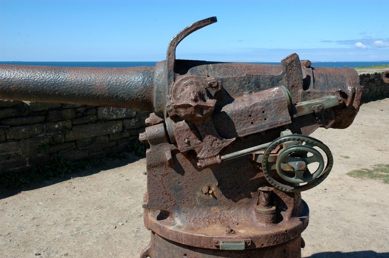 Vue de l'ensemble fortifié de la pointe Saint-Mathieu : détail d'un des deux canons de 95 mm modèle 1888 LahitolleImmatriculation
