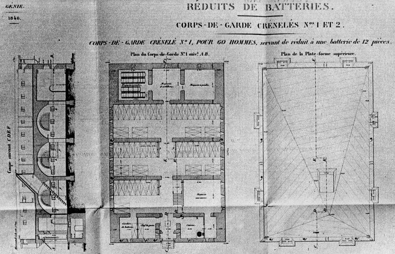 Plans et coupe des corps de garde crénélés n° 1 (pour 60 hommes et une batterie de 12 pièces d'artillerie)Immatriculation