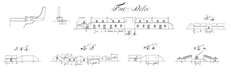 Développements des forts du camp retranché et des batteries de la côte du nord, année 1807. Fort du Delec [Dellec]. Mur d'enceinte percé de créneaux de mousqueterie. Coupe du pont-levis. Divers bâtiments, n° 1 à 7. Fourneau à rougir les bouletsImmatriculation