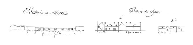 Développements des forts du camp retranché et des batteries de la côte du nord, année 1807. Batterie de Nesven [parapet percé de 7 embrasures plongeantes] (face au goulet). Batterie de Sept (face à la rade)Immatriculation