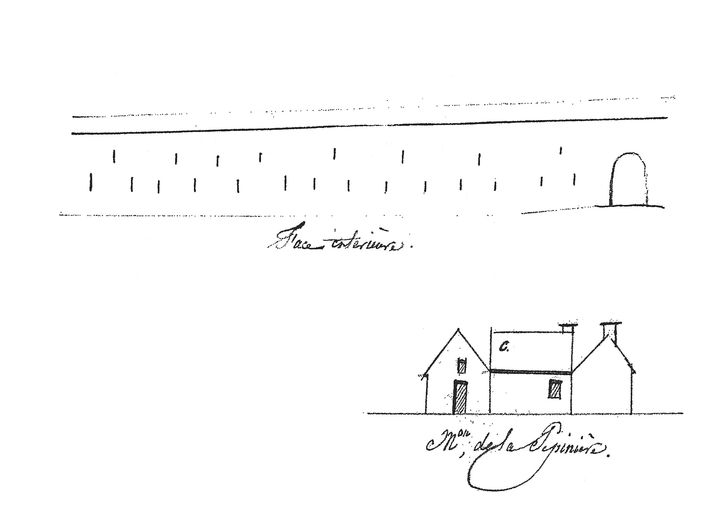Développements des forts du camp retranché et des batteries de la côte du nord, année 1807. Façades des forts de terre et de mer au Portzic. Casemates au fort de terre (face extérieure percée de créneaux de fusillade). Maison de la PépinièreImmatriculation
