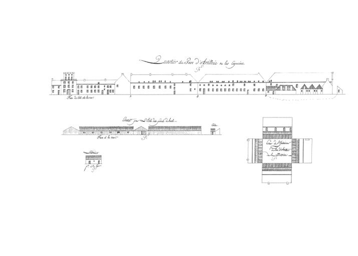 Suite des établissements maritimes, côté de Recouvrance, année 1807. Quartier du Parc d'Artillerie ou les Capucins. Bâtiment pour l'école des pièces de bord. Crèche. Latrines. Cour de l'intérieur du Parc d'Artillerie de la MarineImmatriculation