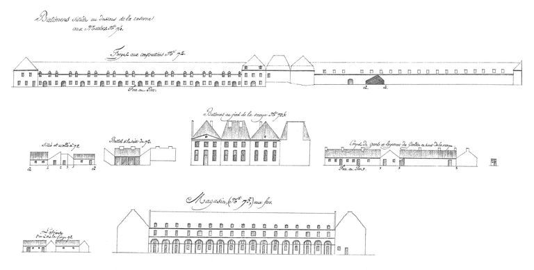 Suite des établissements maritimes, côté de Recouvrance, année 1807. Bâtiments situés au dessous de la caserne aux Matelots n° 74. Forges aux constructions, n° 72. Bâtiment au pied de la rampe, n° 73 b. Magasin aux fers, n° 75Immatriculation