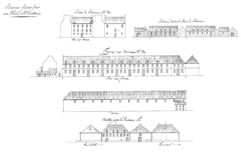 Suite des établissements maritimes, côté de Recouvrance, année 1807. Bâtiments faisant face aux Formes de Recouvrance. Prison de Pontaniou, n° 80. Bâtiment derrière la prison de Pontaniou. Forges aux ancres, n° 82. Nouvelle prison de PontaniouImmatriculation
