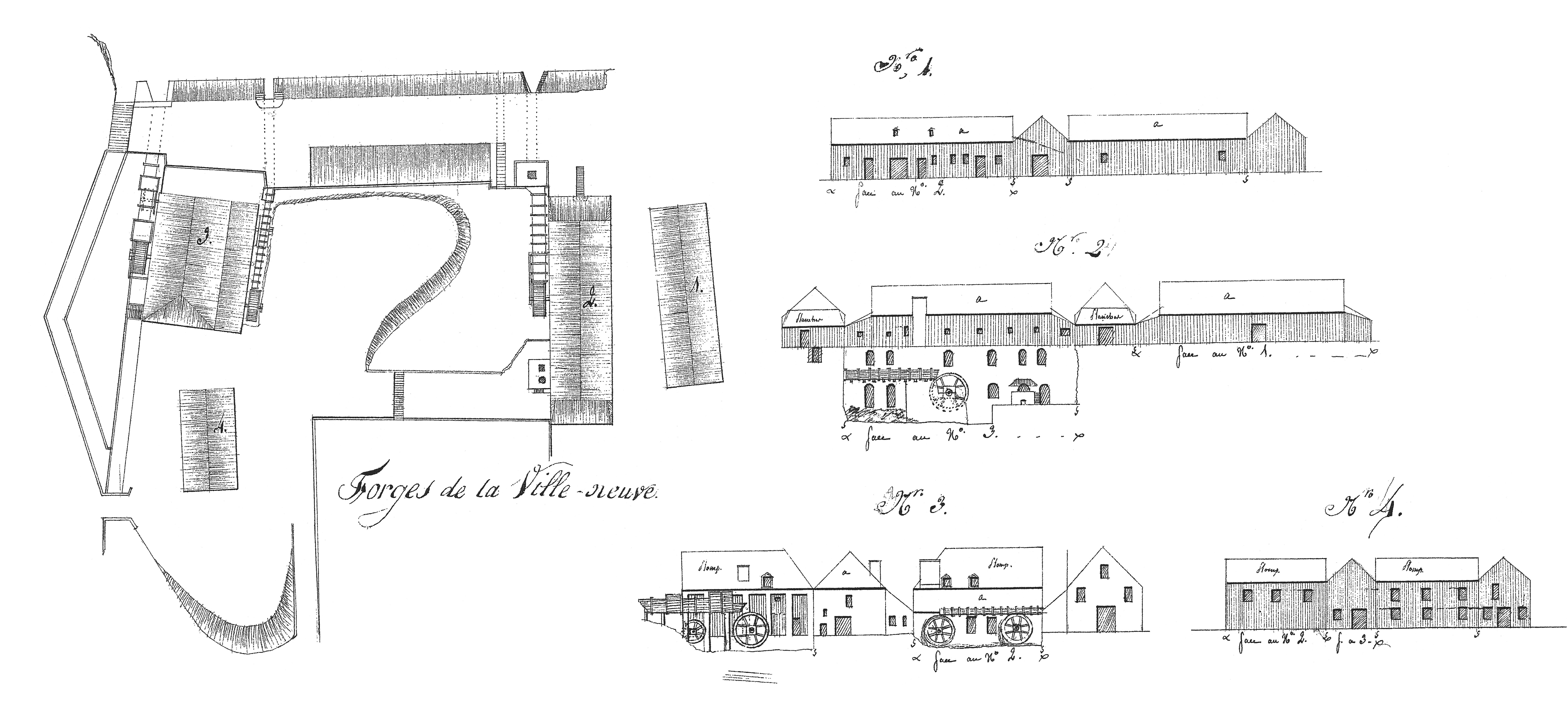 Suite des établissements maritimes, côté de Recouvrance, année 1807. Forges de La Ville-Neuve, plan d'ensemble (bâtiments n° 1 à 4)Immatriculation