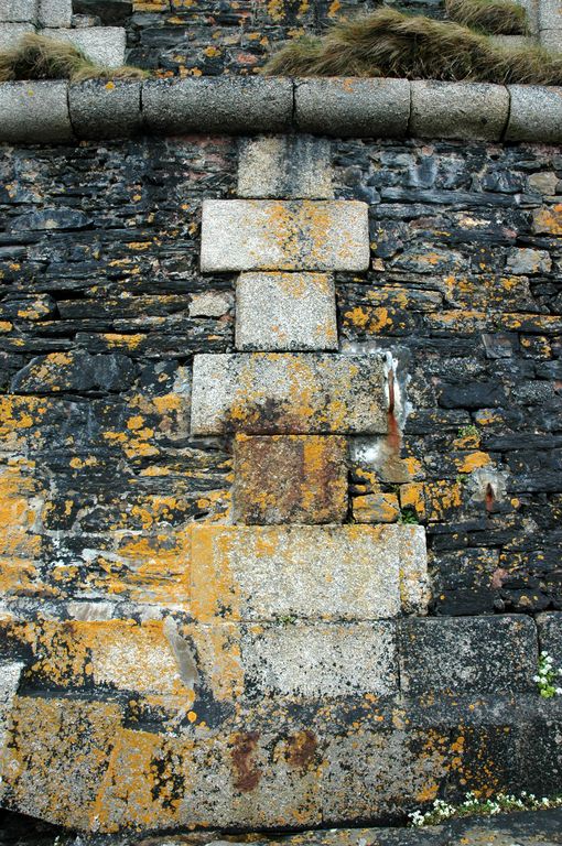 Vue de la batterie de Cornouaille : mur de soutènement de la batterie. Soubassement, chaînes, cordon, gargouilles et encadrement des créneaux en granite, remplissage en moellons de schisteImmatriculation