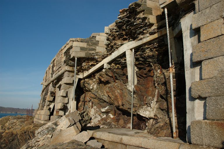 Vue de la batterie de Cornouaille : détail de l'escarpe (mur de soutènement de la batterie). Encadrement des créneaux, et cordon en granite ; remplissage en moellons de schiste (Travaux de stabilisation réalisés par la Direction des Travaux Maritimes)Immatriculation