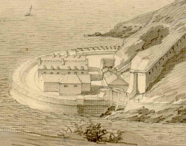 Dessin du fort du Mengant à la fin du 18e siècle, détail de la plate-forme de la batterie basse et des casernements, anonymeImmatriculation